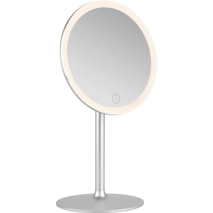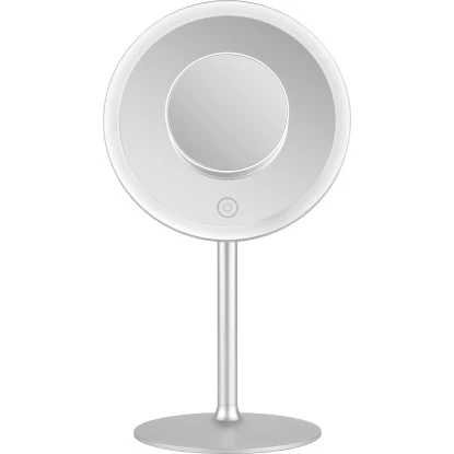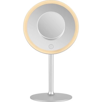 Wiederaufladbarer Kosmetik Standspiegel mit Touchschalter. Aufladung mit USB Kabel möglich. Mit 3 verschiedenen dimmbaren Farbtemperaturen, welche ein Tages-, Abend- oder Innenraumlicht simulieren und somit besonders für den kosmetischen Einsatz geeignet sind. Dank zusätzlichem leistungsstarken 10-fach Vergrößerungsspiegel lassen sich Hautpflegeprodukte oder Augen Make-Up ideal auftragen. Gleichzeitig sorgt die 360° Grad Drehung des großen Spiegels für flexible Sichtwinkel. Beide Spiegel lassen sich magnetisch abnehmen und anbringen.