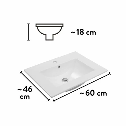 Mit seinen Maßen von 18 cm x 60 cm x 46 cm (H x B x T) nimmt das Waschbecken nicht viel Platz ein und eignet sich auch für kleine Bäder. Dein neuer Waschplatz ist für den Einbau in Badmöbeln in Verbindung mit einer Waschtischarmatur sowie einem verschließbaren Schaftventil vorgesehen.