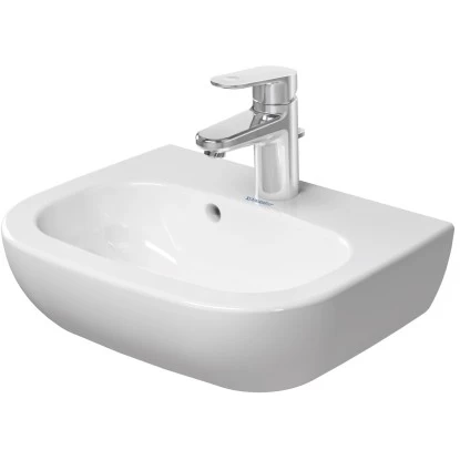 Das weiße Duravit Handwaschbecken D-Code 45 cm ist mit Überlauf und einem Hahnloch ausgestattet. Es ist aus Sanitärkeramik gefertigt und misst HxBxT 145 mm x 450 mm x 340 mm.