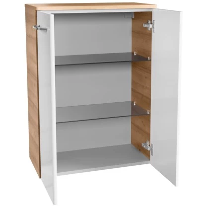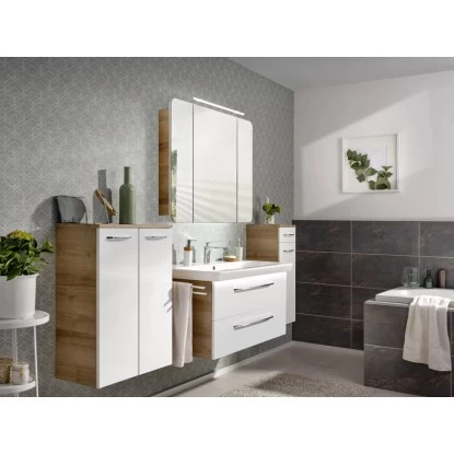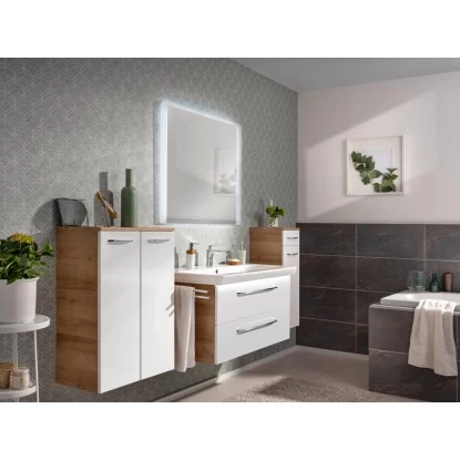 Mit den Artikeln aus der Fackelmann Badmöbel-Serie Milano setzen Sie moderne Akzente in Ihrem Bad und sorgen, egal ob im Gästebad oder in Ihrem Badezimmer, für einen Hingucker. Lassen Sie Ihr Bad in natürlichen Farben erstrahlen und entscheiden Sie zwischen drei tollen Farbvariante. Wählen Sie zwischen wohnlicher Ast-Eiche, klassischem Weiß oder einer hübschen Kombination aus Ast-Eiche und Weiß. Um die schöne Gesamtoptik elegant abzurunden sind alle Schränke mit hochwertigen Griffen aus chromglänzendem Metall ausgestattet. Dank des umfassenden Angebots können Sie Ihre Badeinrichtung je nach Raumgröße erweitern.
