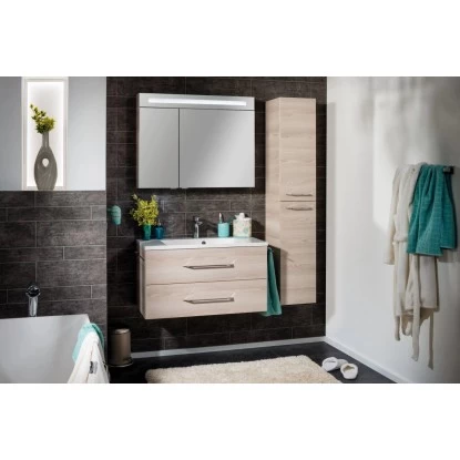 Die Fackelmann Badmöbelserie B.clever zeichnet sich durch modernes Design, attraktiven Dekoren und erstklassiger Qualität aus und bietet clevere Lösungen sowohl für kleine als auch für größere Bäder. Das Programm setzt für Korpus und Front das dunkle, edle Dekor Ulme Madera sowie die helle Alaska-Esche ein. Diese natürlichen Holznachbildungen bringen wohnliche Atmosphäre ins Bad und harmonieren perfekt zu hellen oder dunklen Fliesen und Accessoires. Ebenso erhältlich: das klassische Weiß in matt für den Korpus und Hochglanz-Ausführung für die Front. Als Griff kommt bei der Serie B.clever eine besonders designte Metallreling in chromglänzender Optik zum Einsatz.