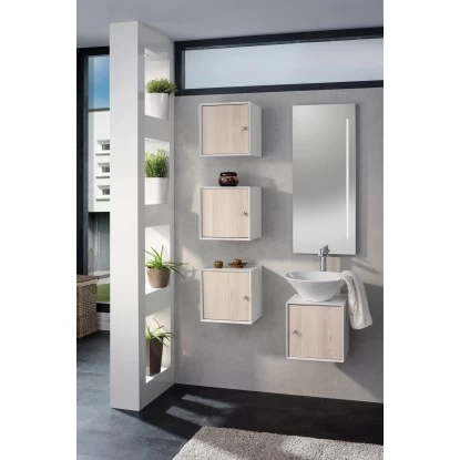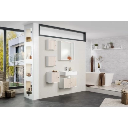 Die ix! Würfel-Optik der Schränke mit dem x-Griff aus silber-mattem Zink-Druckguss, der als strahlendes Symbol der gesamten Serie dient, lädt zum fröhlichen Kombinieren ein. Durch die frei wählbare Anordnung der Schränke und Boxen ergeben sich symmetrische Aufbauten oder verspielte Schachtelungen mit vielseitigen Ablagemöglichkeiten. ix! ist hängend konzipiert und wird teilmontiert zum einfachen Selbstaufbau geliefert.