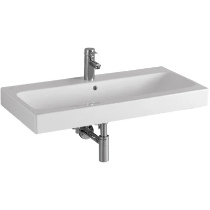 Durch sein großes, langgezogenes Becken bietet das Waschbecken Komfort und viel Platz beim Waschen für die ganze Familie. In schlichtem Weiß lässt es sich mit Ihren Dekorationen, Handtüchern und Möbeln kombinieren. Die Breite für den möglichen Unterschrank liegt bei 89 cm.