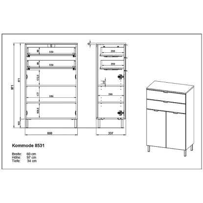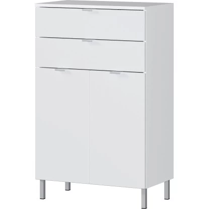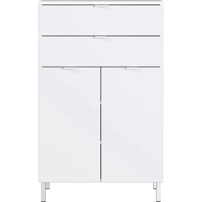 Die Badkommode 8531 von Germania ist mit zwei Schubladen und zwei Türen ausgestattet. Die Türen und Schubladen schließen durch integrierten Dämpfer langsam, sanft und geräuschlos. Mit seinen Maßen findet der Schrank spielend Platz unter jedem Waschbecken. Die Aussparung für den Siphon lässt diesen geschickt im Innenraum des Möbels verschwinden. Die zwei verstellbaren Einlegeböden erlauben es Ihnen das Möbel an Ihre individuellen Bedürfnisse anzupassen, so dass Waschutensilien und Handtücher ihren Platz finden.
