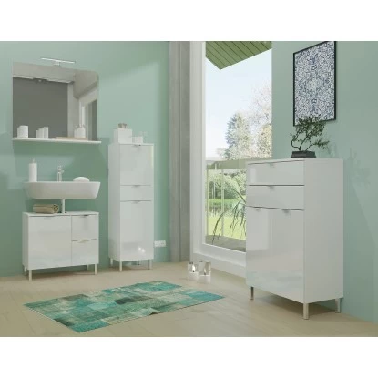 Um das Badezimmer oder Gäste-WC in eine wahre Wellness-Oase zu verwandeln, eignen sich die Möbel aus diesem Programm perfekt. Durch verschiedene Farbvarianten passt sich dieses Bad-Programm jedem Einrichtungsstil an. Gemütlich und freundlich überzeugt die Variante in Grandson-Eiche mit Hochglanzfronten in Weiß. Besonders modern kommt die Variante in komplett in Weiß daher. Die edlen weißen Fronten mit Hochglanz-Oberfläche sind mit Kantengriffen in der Farbe Chrom versehen. Auch die Füße der Standmodelle sind aus Metall und in der Farbe Chrom.