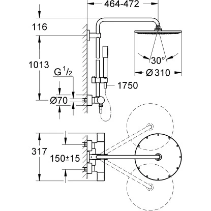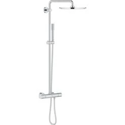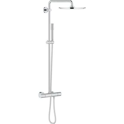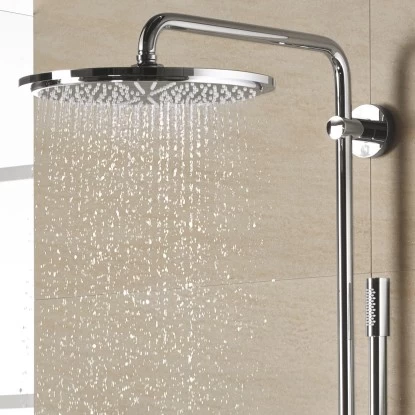 Das Grohe Überkopf-Brause-Set Rainshower System 310 in der Chrom, sorgt mit seinem komfortablen Thermostat und Aquadimmer Funktion, für ein gemütliches Sommerregen-Erlebnis. Dieses System besticht durch die große Metall-Kopfbrause und den bis zu 180° horizontal schwenkbaren 45 cm Brausearm zur flexiblen Gestaltung Ihres persönlichen Duschbereichs. Durch die gleichmäßige Wasserverteilung auf jede einzelne Düse wird eine samtweiche Berieselung und damit ein unvergleichliches Wellness-Erlebnis erreicht. Die schlanke Handbrause sieht gut aus und hat einen starken Strahl. Sie kann mithilfe des Gleitelements an der Wandstange stufenlos positioniert werden. Sowohl Kopf- als auch Handbrause sind aufgrund flexibler Silikon-Düsen einfach kalkfrei zu halten. Zudem garantiert die hochwertige Chrombeschichtung eine problemlose Reinigung. Die Grohe CoolTouch Technologie verhindert das Aufheizen der Thermostatoberfläche und schützt so die empfindsame Haut der ganzen Familie.