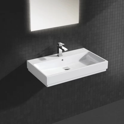 Der Grohe Waschtisch Cube ist das Ergebnis einer eckigen Designsprache, die auf gerade Linien und alpinweißen Feinfeuerton setzt. Zudem kann das Waschbecken mit einer Schutzbeschichtung überzeugen, die im Alltag eine ganze Reihe an Vorteilen mit sich bringt.