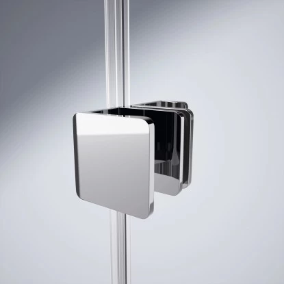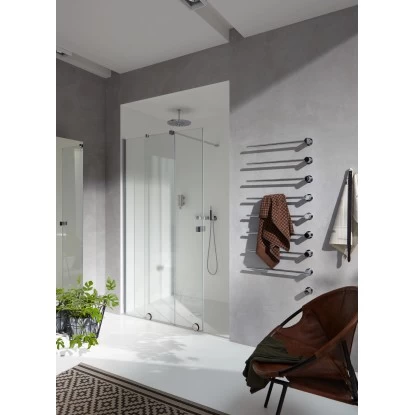 Die Hüppe Xtensa Pure bietet ein Höchstmaß an Transparenz durch konsequente Reduzierung der Metallkomponenten auf ein Minimum, vor allem durch den Verzicht auf die obere Führungsschiene der Gleittüren.