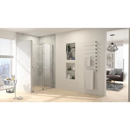 Die Hüppe Xtensa Pure bietet ein Höchstmaß an Transparenz durch konsequente Reduzierung der Metallkomponenten auf ein Minimum, vor allem durch den Verzicht auf die obere Führungsschiene der Gleittüren.