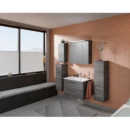 Als wandelbarer Allrounder und im kubischen Stil gestaltet, ist diese Badmöbelserie ein wahrer Bestseller. Die klare Formensprache bestimmt das zeitgemäße Design des Kundenlieblings. Typisch ist der Dreiklang seiner Elemente: Zunächst das Waschbecken. Das pflegeleichte Mineralmarmorwaschbecken mit seiner geradlinigen Form passt perfekt zum Waschbeckenunterschrank. Die Oberflächen der verschiedenen schönen Dekore werden mit einer hochwertigen Folie überzogen. Die Innenseiten der Möbel sind melaminbeschichtet und damit leicht zu reinigen und weniger feuchtigkeitsanfällig. Die Waschtischunterschränke sind mit geräumigen und leichtlaufenden Schubkästen und dazugehörigen schönen chromglänzenden Griffen ausgestattet, die bei der täglichen Ordnung im Bad unersetzlich sind. Das Multitalent macht auch vor den Spiegelschränken, dem Mittelpunkt eines Badezimmers, nicht halt. Eine hochwertige Ausstattung mit modernen LED-Leuchten, drei Spiegeltüren und einem Stecker/Schaltermodul überzeugt jeden Tag bei der Schönheitspflege. Trentino passt sich jedem Ambiente mühelos an.