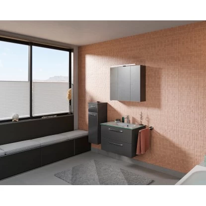 Als wandelbarer Allrounder und im kubischen Stil gestaltet, ist diese Badmöbelserie ein wahrer Bestseller. Die klare Formensprache bestimmt das zeitgemäße Design des Kundenlieblings. Typisch ist der Dreiklang seiner Elemente: Zunächst das Waschbecken. Das pflegeleichte Mineralmarmorwaschbecken mit seiner geradlinigen Form passt perfekt zum Waschbeckenunterschrank. Die Oberflächen der verschiedenen schönen Dekore werden mit einer hochwertigen Folie überzogen. Die Innenseiten der Möbel sind melaminbeschichtet und damit leicht zu reinigen und weniger feuchtigkeitsanfällig. Die Waschtischunterschränke sind mit geräumigen und leichtlaufenden Schubkästen und dazugehörigen schönen chromglänzenden Griffen ausgestattet, die bei der täglichen Ordnung im Bad unersetzlich sind. Das Multitalent macht auch vor den Spiegelschränken, dem Mittelpunkt eines Badezimmers, nicht halt. Eine hochwertige Ausstattung mit modernen LED-Leuchten, drei Spiegeltüren und einem Stecker/Schaltermodul überzeugt jeden Tag bei der Schönheitspflege. Trentino passt sich jedem Ambiente mühelos an.