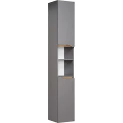 Der moderne Hochschrank überzeugt neben der ansprechenden Optik auch mit seiner hohen Funktionalität. Er ist mit zwei Drehtüren, zwei Einlegeböden aus Glas und einer Nische ausgestattet und bietet viel Platz für die optimale Aufbewahrung von Handtüchern & Co. Die zwei Schranktüren sind mit gedämpften Scharnieren ausgestattet und schließen dadurch sanft und besonders leise.