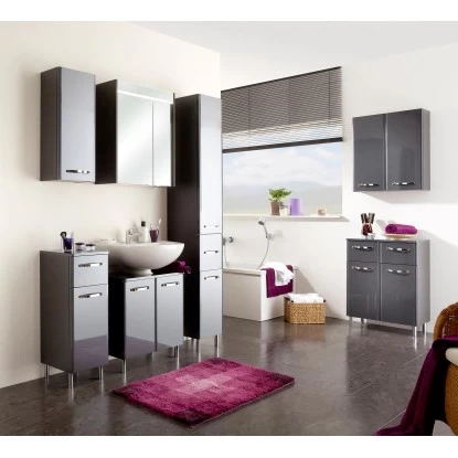 Mit dem Badmöbel-Set Velo erhalten Sie eine perfekt aufeinander abgestimmte Badmöbelserie für einen eleganten Look in Ihrem Badezimmer. Die Fronten und Korpen der geradlinigen Kombinationen mit den weichen Kanten sind im eleganten, glänzenden Anthrazit gehalten. Neben der hohen Qualität durch hochwertige Verarbeitung bietet das Set eine tolle Kombination aus Waschtischunterschrank, Spiegelschrank und Beimöbeln. Die Beimöbel sind entweder mit komfortablen Schubkästen oder mit gedämpften Türen ausgestattet und bieten viel praktischen Stauraum, der durch zusätzliche Einlegeböden zudem bestens organisiert werden kann. Der Waschbeckenunterschrank passt zu jedem Waschbecken. Der Spiegelschrank sorgt sowohl für perfekte Organisation als auch für perfektes Licht durch die LED-Aufsatzleuchte. Das Set Velo kann wandhängend oder stehend (Fuß-Set separat erhältlich) montiert werden, so wie es Ihnen am besten gefällt. Überzeugen auch Sie sich von dieser Kombination aus Design und Qualität in Ihrem eigenen Zuhause.