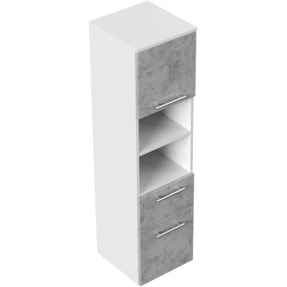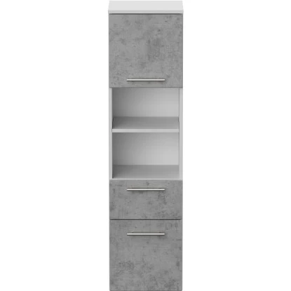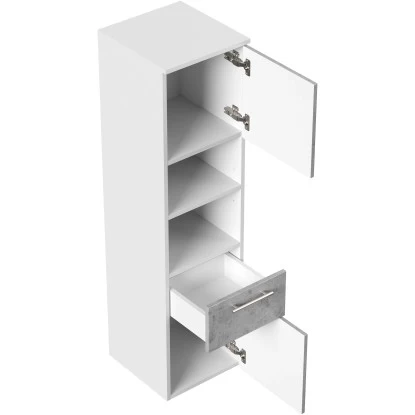 Das Badmöbel-Set Viva zeichnet sich durch modernes Design und hochwertige Qualität aus. Die Serie ist in verschiedenen Farben erhältlich und bietet tolle Kombinationsmöglichkeiten. Die Fronten der Möbel sind auch über die Kanten und Ecken mit einer hochwertigen Beschichtung versehen. Die weichen Kanten verleihen dieser Möbelserie eine schöne 3D-Optik. Der Korpus ist in Weiß matt gehalten während für die Fronten sowohl die Farben Weiß Hochglanz, Schwarz und Anthrazit als auch eine edle Betonoptik zur Auswahl stehen. Der Hochschrank ist die ideale Ergänzung zu Ihr Badmöbel-Set Viva.