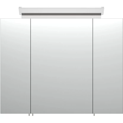 Sämtliche Ansprüche an einen Spiegelschrank finden Sie hier erfüllt: Neben der atmosphärischen Beleuchtung ist zusätzlich an der Seite der An- und Ausschalter sowie eine praktische Stromsteckdose angebracht. Hier können Sie beispielsweise Ihren Fön oder Rasierer ganz ohne Kabelsalat einstecken. Die Türe schließt sanft mit dem Soft-Close-Schließsystem. Die hochglänzende weiße Beschichtung ist wasserabweisend.