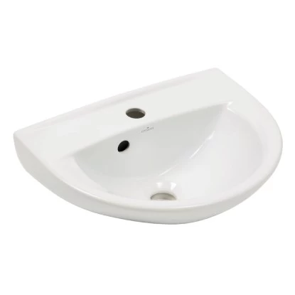 Formschönes, weißes Handwaschbecken mit einer Breite von 45 cm Breite.