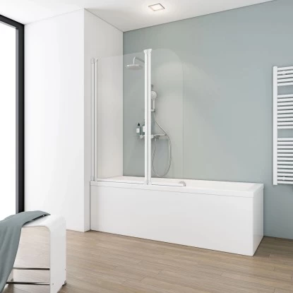 Der zweiteilige Schulte Badewannenaufsatz dient dazu, die Duscheinheit optisch von der Badewanne zu trennen und sie somit komfortabel in eine Duschkabine umzuwandeln. Der Aufsatz hat die Maße 140 cm x 115 cm. Er besteht aus klarem 3-mm-starkem Echtglas und einem Profil in der Farbe Alpinweiß. Das Glaselement kann rechts- oder linksseitig montiert werden. Die Schwenkrichtung des ersten Elements beträgt dabei innen und außen je 90°. Das zweite Element ist 360° schwenkbar, wodurch es besonders platzsparend ist. Das Montagematerial ist bereits inklusive.