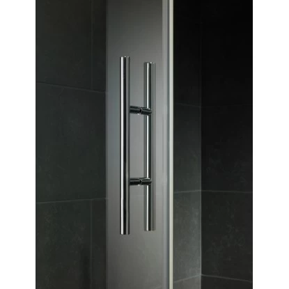 Die Drehtür für Nische besteht aus 8 mm Einscheiben-Sicherheitsglas. Die innen bündigen eckigen Scharniere sind bereits vormontiert und schließen innen bündig mit der Glasfläche ab. Die Reinigung Ihrer Duschkabine wird damit zum Kinderspiel. Durch den verdeckten Heb-Senk-Mechanismus der Scharniere hebt die Tür beim Öffnen leicht an und senkt sich beim Schließen wieder ab. Erhöhte Dichtigkeit und zuverlässiges Schließverhalten sind dadurch garantiert. Der verdeckte Heb-Senk-Mechanismus wird erst beim Bewegen der Tür bemerkbar. Das Dekorglas Dezent und der große Stabgriff verleihen dieser Drehtür einen eleganten Look.