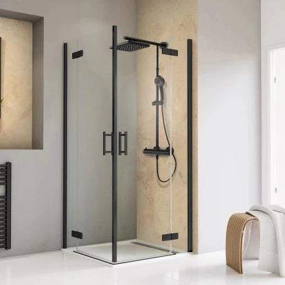 Der pendelbare vierteilige Schulte Eckeinstieg Toura überzeugt mit zwei großen, nach außen öffnenden Drehtüren aus 8 mm starkem Sicherheitsglas (ESG). Des Weiteren sind die beiden Duschtüren mit jeweils zwei formschönen Scharnieren an je einem Nebenteil montiert, welches mittels eleganter Wandanschlussprofile zuverlässig in Ihrer Einbausituation befestigt werden. Dank der zwei, 2000 mm hohen Türen, die über Eck öffnen, stellt dieser Eckeinstieg einen ausgesprochen komfortablen Einstiegsbereich bereit. Alle Profile und Anbauteile der Duschabtrennung überzeugen in modernem Schwarz.