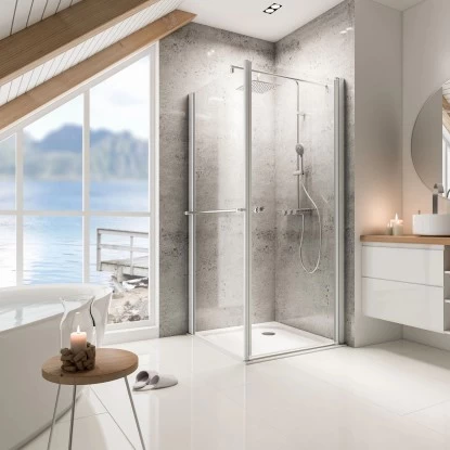 Die Schulte Drehtür inklusive Seitenwand Garant punktet mit dem zeitlosen Design, welches durch zwei hochwertige Aluminiumprofile dominiert wird. Dieses verleiht jedem Bad einen besonderen Charme. Darüber hinaus kann die brillante Glasfläche der Tür dank ihrer eleganten Teilrahmung optimal auf ihre Umgebung wirken und so auch kleine Bäder größer erscheinen lassen.