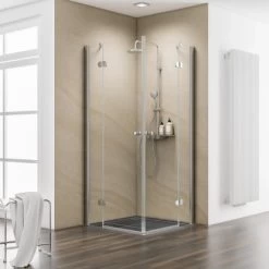 Der MasterClass Eckeinstieg besitzt zwei nach außen öffnende Drehtüren mit einem großzügigen Einstieg. Der verdeckte Heb-Senk-Mechanismus der Türen sorgt für eine erhöhte Dichtigkeit sowie ein zuverlässiges Schließverhalten. Durch die vormontierten innen bündigen Halbkreis-Scharniere ist eine einfache Pflege und eine einfache Montage der Dusche gegeben. Diese liegen mit der Glasfläche bündig auf. Dadurch können Wassertropfen einfach entfernt werden. Die im Lieferumfang enthaltenen Stabilisationsbügel garantieren einen sicheren Stand der Dusche.