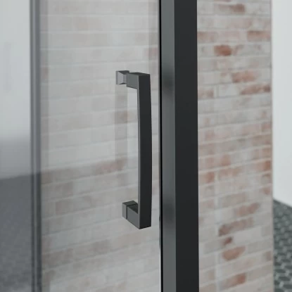 – Klar-helle Sicherheitsglaselemente kombiniert mit mattschwarzen Profilen machen die Duschkabine zu einem echten Hingucker im Bad.
