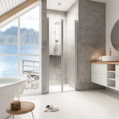 Der durchgehende Magnetverschluss der Duschkabine garantiert ein perfektes Abdichten der Tür. Die beiden Türen öffnen nach innen und außen. So bietet diese Pendeltür einen großzügigen Einstieg, spart jedoch gleichzeitig eine Menge Platz. Der verdeckte Heb-Senk-Mechanismus garantiert eine erhöhte Dichtigkeit und ein zuverlässiges Schließverhalten der Türen.