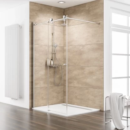 Die Serie MasterClass von Schulte zeichnet sich durch ihre rahmenlose Optik mit 6 mm Echtglas aus. Die Walk In 5 der Serie MasterClass besteht aufgrund ihrer speziellen Konstruktion aus 8 mm Echtglas. Als Walk In bietet sie einen freien Einstieg ohne Tür.