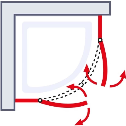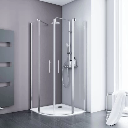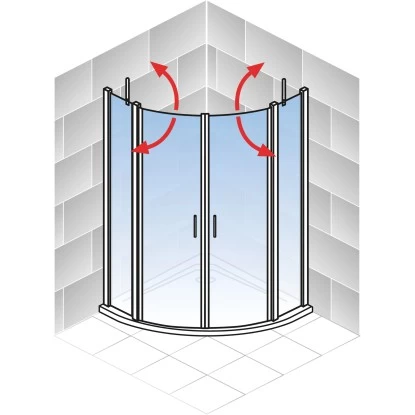 Diese Runddusche mit Drehtür der Serie Alexa Style 2.0 von Schulte überzeugt mit vier großflächigen Echtglasscheiben (ESG), von denen zwei feststehend sind. Die beiden nach außen zu öffnenden Drehtüren sind mit schönen Aluminiumprofilen an diesen Seitenteilen befestigt. So entsteht ein großzügiger Einstieg in die Runddusche.