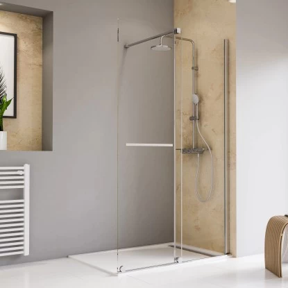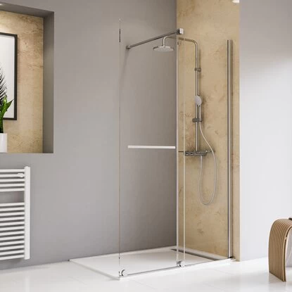 Die Serie Toura von Schulte verfügt über hochwertige, 8 mm starke Elemente aus Sicherheitsglas(ESG), welche von einer formschönen Profil- und Scharnieroptik umgeben sind – für höchste Ansprüche und einen exquisiten Charme in Ihrem Bad. Diese praktische Duschwand Walk In mit Schiebetür der Serie Toura von Schulte überzeugt auf den ersten Blick mit ihren zwei 8 mm starkem Echtglaselementen (Sicherheitsglas-ESG) sowie ihren eleganten Anbauteilen aus Aluminium in Chromoptik. Die hochwertigen Materialien sowie die durchdachte Konstruktion ermöglichen eine, für Walk In Duschwände überdurchschnittlich, gute Spritzwasserdichtigkeit und ein hohes Maß an Standsicherheit. Die Schiebetür, welche über formschöne Laufrollen an der unteren Kante der Glaselemente läuft, stellt darüber hinaus einen ebenso großzügigen wie flexiblen Einstiegsbereich bereit. Des Weiteren fungiert der Handtuchhalter an der Außenseite der Schiebetür auch als Accessoire der Duschtür.