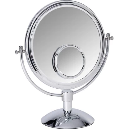 Der Wenko Spiegel Grando bietet neben der 100 % Spiegelfläche eine 3-fach bzw. 7-fach Vergrößerung für den kosmetischen Einsatz. Er besitzt eine extrem große Spiegelfläche mit einem Durchmesser von 27 cm, die sich nach Bedarf neigen und umklappen lässt.